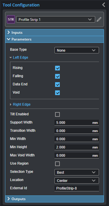 When Base Type is set to Flat, both strip (raised area) and base support regions are needed. When set to None, only a point that deviates from a smooth strip support region is needed to find a rising or falling edge. |