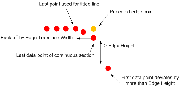 The algorithm then backs off by the value of the Edge Transition Width parameter and uses the data up to the back-off point to create the fitted line and projects the edge point on the line. This step prevents the points near the end of a rounded strip from affecting the height of the strip.