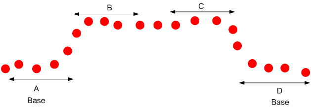 A strip is a flat region bounded on the left and on the right by edges. The Strip tool can measure the edge positions, width, and height of a strip. The Strip tool assumes that regions outside the strip, referred to as the base regions (Region A and D below), deviate in height from the start and end parts of a strip (Region B and C).