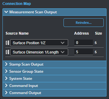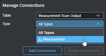Table When GoPxL is running on a sensor, Table only contains two options (Measurement Scan Output and Stamp Scan Output), which represent register assemblies. When GoPxL is running on GoMax NX, Table contains an additional entry (Sensor Group State). Use this parameter to choose which register a source is added to. Type Use Type to optionally filter the connection types available to be added or inserted.