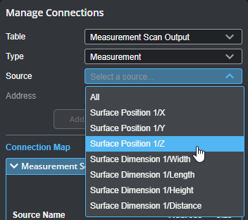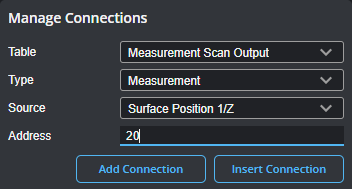 Add Connections Adds one or more connections to the connection map. If Type is set to All Types, all available sources are added. If Type is set to a specific type, the source selected in Source is added (or all sources of that type if All is selected). By default, connections are added directly after the last source in the connections map. You can optionally set the address at which a source is added using the Address parameter.