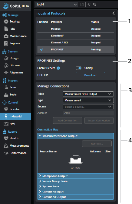 You can use a PROFINET Programmable Logic Controller (PLC) over Ethernet to operate a sensor and receive measurement values and decisions. Modbus only supports a subset of the tasks that can be accomplished in the web interface (for example, starting, stopping, and aligning sensors, and switching Jobs). Scan data can't be sent to the PLC.