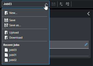 Job menu and Save button. Use the job menu to create new jobs, save jobs, and load recent jobs.