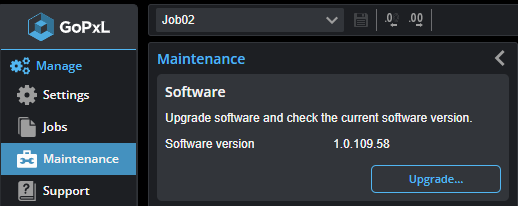 Note that if you are running a sensor through a PC instance of GoPxL, you can't upgrade its software. To do this, you must temporarily remove it from the sensor group in the PC instance of GoPxL, access the sensor directly at its IP address, and perform the upgrade. You can then add it back to the sensor group on the PC instance of GoPxL. For more information, see Stopping Acceleration.