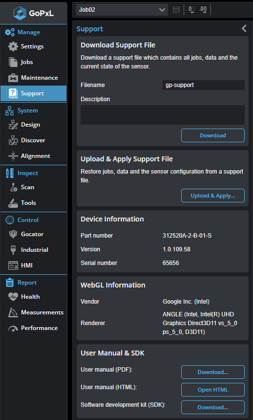 The Support page in the Manage category lets you download or upload a support file and get software version information. You can also access the user manual and download the SDK. Use support files for troubleshooting.