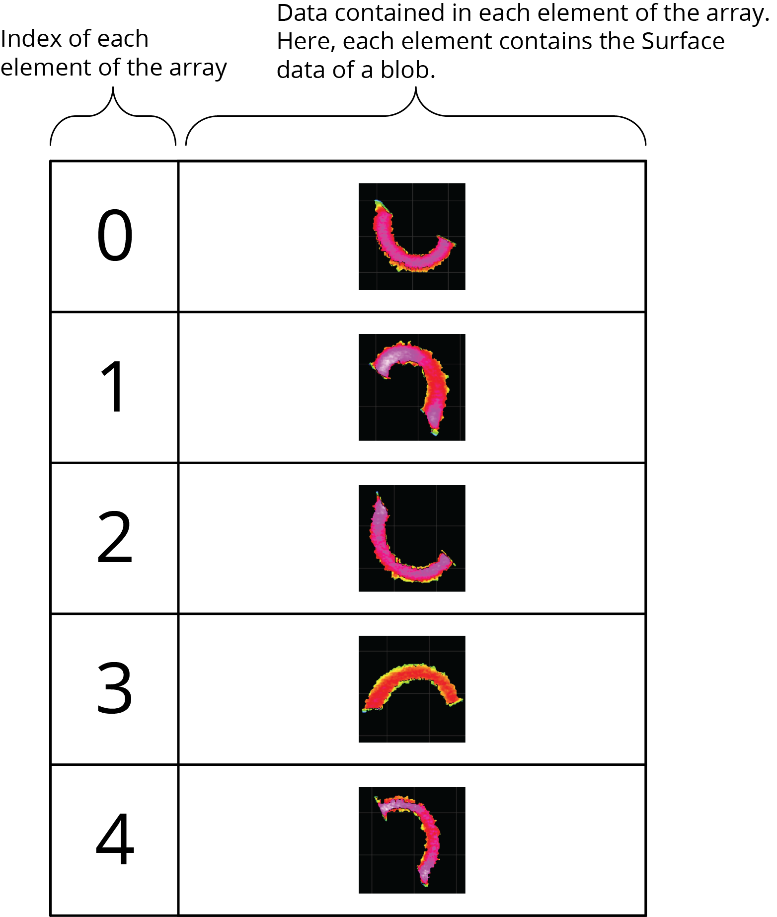 An array containing objects identified in some scan data could be represented in the following way. (These are "blobs" from the Surface Blob tool.)