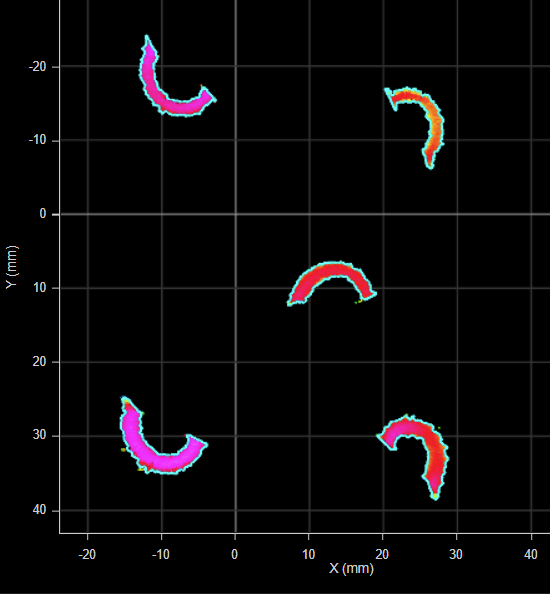 The Surface Blob, Surface Segmentation, and Surface Pattern Matching tools can identify multiple occurrences of features or parts in scan data. When you check Enable Array Output in the tool's Parameters section, the tool outputs an array containing the occurrences. Otherwise, the tools produce a separate output for each identified feature or part. In the following, a Surface Blob tool has identified five blobs in scan data.