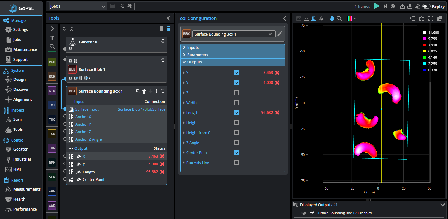The following shows the Surface Bounding Box tool in batching mode (taking the Surface Blob tool's array of outputs as intput). The tool calculates the bounding box for each element in the input array, and returns the enabled measurements as arrays. That is, it returns an X, Y, and Z measurement for each object, in the X, Y, and Z arrays.