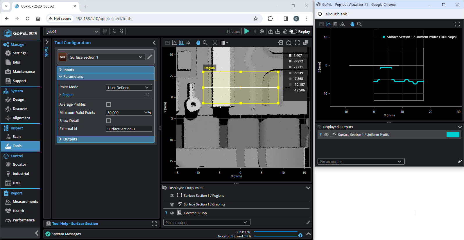 Main view in original browser window showing surface data and a defined section, and a second window showing a Profile tool running on the section.