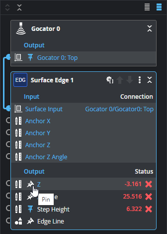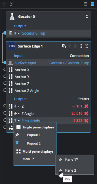 Pinning outputs is useful if you want to monitor multiple, independent measurements while GoPxL is running in production. Pinning is also useful when setting up tools: you can change the parameters of a tool (such as a filter) earlier in a tool chain and immediately see the impact that change has on another tool (whose output is pinned) later in the chain. This minimizes toggling and clicking between tools and measurements.