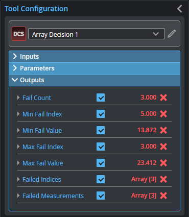 The Array Decision tool takes an array of measurements as input and applies individual minimum / maximum thresholds to one or more of the array elements. The tool returns results related to fails (number of fails, index and value of max/min fail, as well as arrays of failed measurements and their indices).