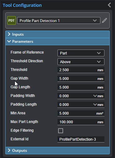 The Profile Part Detection tool takes a series of profiles as input, analyzes the characteristics of each profile based on the configuration of the tool's parameters, and identifies discrete objects and then outputs them as Surface data. Surface measurements can then be performed on each object. This method of surface generation is typically used when a transport system such as a conveyor continuously feeds parts or material under a sensor. The parts or material must have a distinguishable start and stop edge. The sensor continuously generates surfaces of parts that are detected under the sensor.