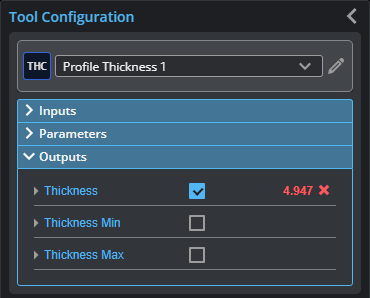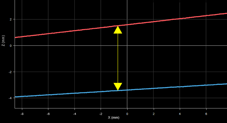The Thickness tool lets you perform thickness measurements between the two profiles you specify.