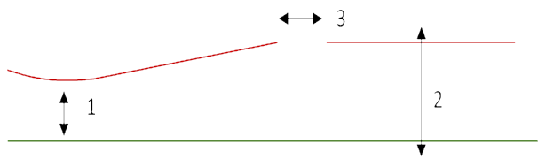 The setting is only displayed if you have configured more than one layer, and is only displayed in the Layer 0 section, as it only applies to the first layer. Points in transparent surfaces are sorted to different layers based on their Z position. But if there are gaps in the first layer (and when this parameter is disabled), a data point from second layer is considered to be part of the first layer. When this parameter is enabled, however, missing points from the first layer are interpreted instead as gaps, and the points in that gap are kept with the second layer. Detect missing layer works with the value of Min thickness (see above). If Min thickness is incorrectly greater than the distance between two layers, the second layer is not detected and the top layer is reported as a second layer. Maximum gap width is the maximum width which will be interpreted as missing layer points. Only available when Detect missing layer is enabled. The following illustrates how the various settings work together: 1) Min thickness for the layer; 2) Max thickness for the layer; 3) Maximum gap width.