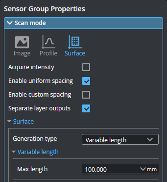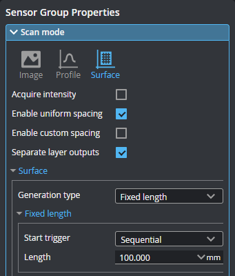 The sensor generates surfaces of a user-configurable fixed length. You must set the length and the start trigger the sensor uses to produce Surface data.