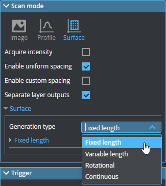 - Software Trigger: Allows starting fixed length surfaces on command from a PC or a PLC.