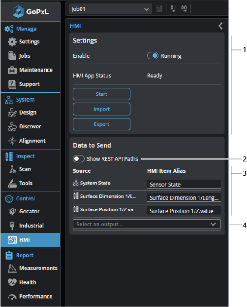 You configure the HMI on the Control > HMI page. For details, see GoHMI and GoHMI Designer.