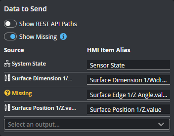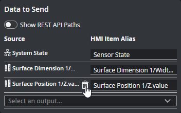 The list of outputs (scan data and tool outputs) that GoPxL will send to an HMI. You can remove an output from the list by hovering over it and clicking the trashcan icon.