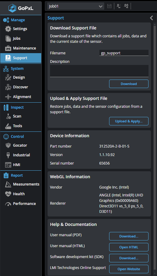 The Support page in the Manage category lets you download or upload a support file and get software version information. Support files are useful for supporting development and diagnosing issues.