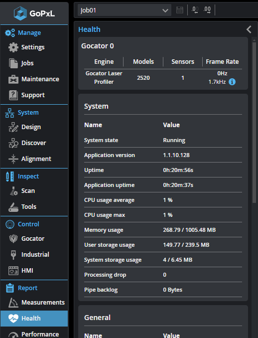 When a sensor is being accelerated (by a PC instance of GoPxL or by GoMax NX), the value reported in the System section comes from the accelerator. However, only the following metrics are appreciably different when accelerated: Uptime, CPU Usage, Memory Usage, and System/User Storage Usage. |