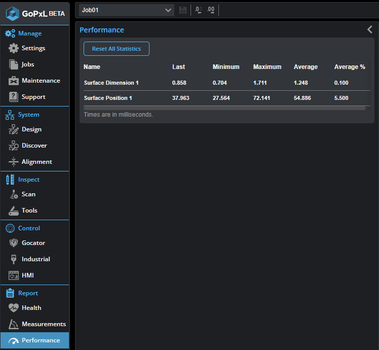 The Report > Performance page displays performance statistics (execution time in milliseconds) for each tool added in the Inspect page.