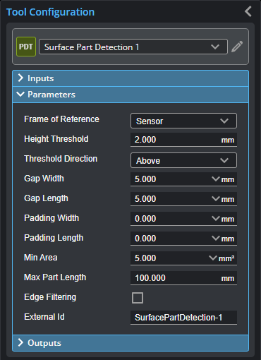 Determines the minimum area for a detected part. Set this value to a reasonable minimum in order to filter out small objects or noise. |