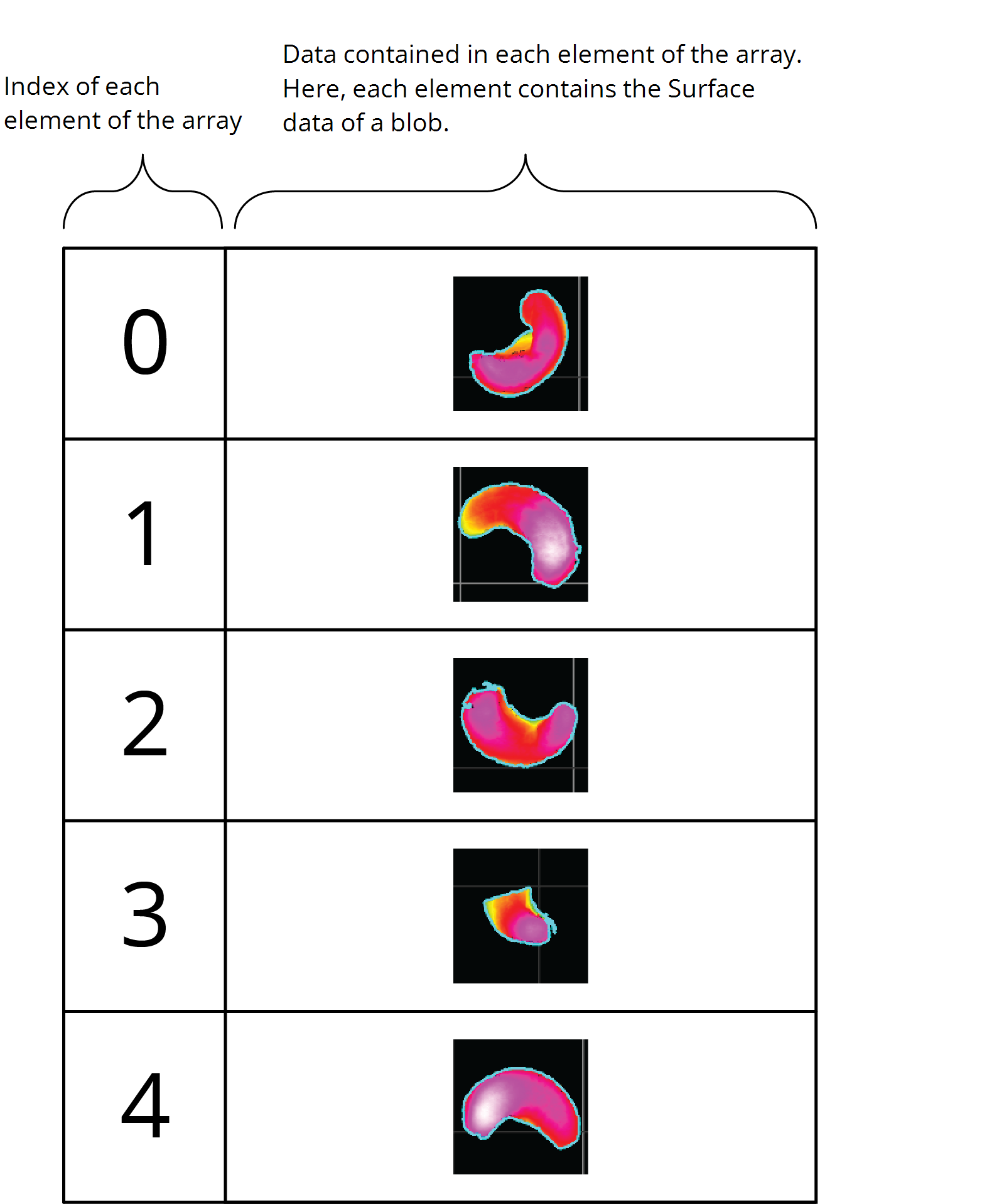 An array containing objects identified in some scan data could be represented in the following way. (These are "blobs" from the Surface Blob tool.)