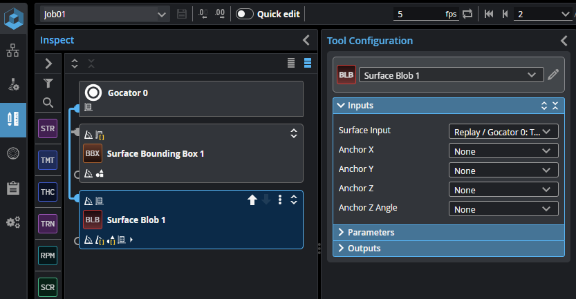 Surface Blob tool identifying blobs in scan data.