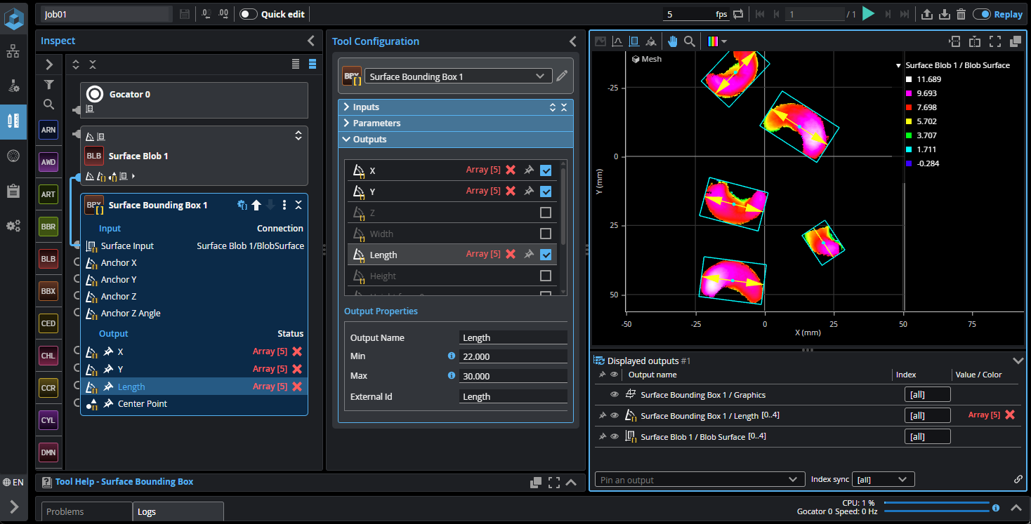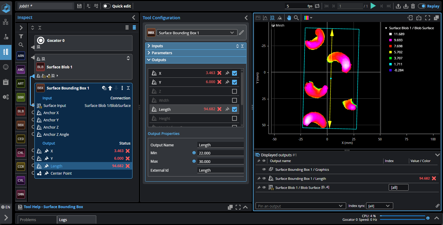 The following shows the Surface Bounding Box tool in batching mode (taking the Surface Blob tool's array of outputs as input). The tool calculates the bounding box for each element in the input array, and returns the enabled measurements as arrays. That is, it returns an X, Y, and Z measurement for each object.