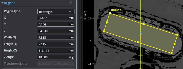 The regions of some tools can be rotated by setting the region's Z Angle (or Angle for some models) to better accommodate angled features on a target. By rotating the measurement region, data not related to the feature can often be excluded, improving accuracy of measurements. You can modify the size and position of a rotated region.