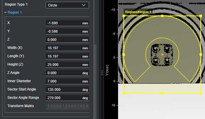 Note that the angles defining a partial circular/elliptical region are relative to the region, and not the sensor's coordinate system. So a region rotated 30 degrees using its Z Angle setting rotates the start angle and angle range by 30 degrees.
