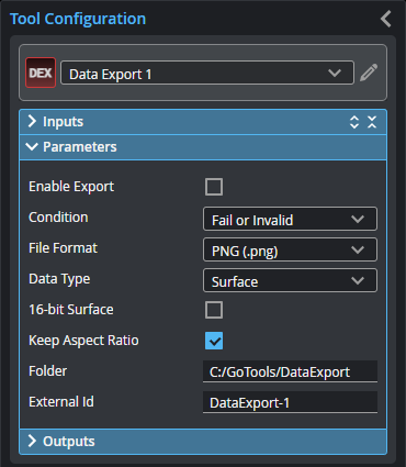 The Data Export tool saves frames of scan data to local PC storage (by default, C:\GoTools\DataExport), letting you import and evaluate scan data in 3rd-party applications.