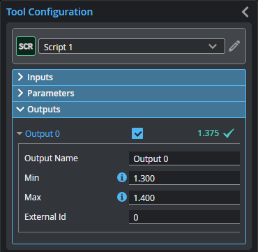 To set what measurement values are considered a Pass, select a measurement in the Outputs list and configure its Min and Max parameters in the Output Properties section. To return a Pass decision, the measurement must be between the maximum and minimum values; the range is inclusive.
