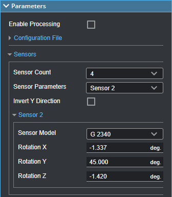 A drop-down that display the settings of the selected sensor. For descriptions of the individual sensor parameters used for the alignment, see Sensor Parameters. |