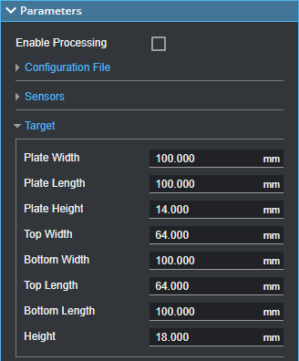 An expandable section that contains parameters related to the double-sided pyramid target's specifications. For descriptions of the pyramid parameters, see Double-Sided Pyramid Target Parameters. |