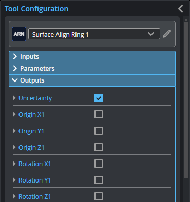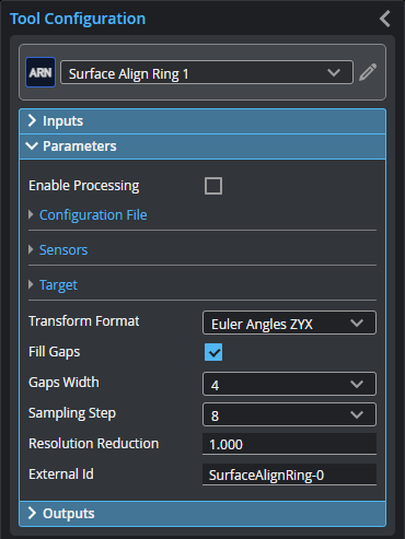 After configuring Surface Align Ring (see below), you must check the Enable Processing checkbox to produce the XML initialization file. After the tool has finished processing the data and has successfully aligned the sensors, it produces the XML file you load into a Surface Mesh tool. Note that the tool actually creates two copies of the initialization file: one called Configuration.xml, and another with a date-time stamp in its name, such as Configuration_20240531_120452.xml. The tool also creates Difference Surface and Segmentation Surface data outputs that you can use to assess the quality of the alignment.