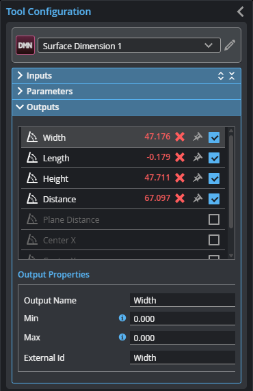 To set what measurement values are considered a Pass, select a measurement in the Outputs list and configure its Min and Max parameters in the Output Properties section. To return a Pass decision, the measurement must be between the maximum and minimum values; the range is inclusive.