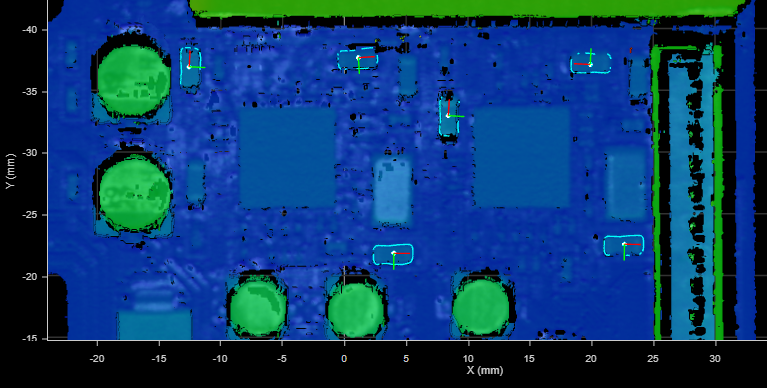 Other measurement tools can then be placed over the capacitors, without needing to anchor them. In the following image (the third frame, which was significantly shifted and rotated), a Surface Filter tool isolates the capacitors based on height. Subsequent tools can perform measurements on the isolated data to verify that all capacitors are present, are seated properly, and so on.