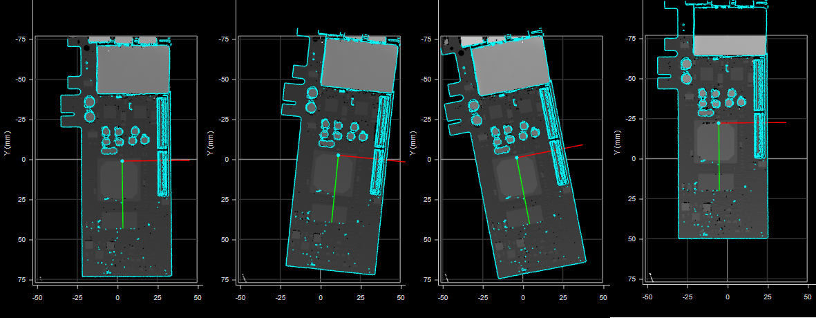 Note that when you use the geometric features with a Surface Transform tool to transform the scan data from frame to frame, you can often avoid the need to anchor other measurements, because the transforms ensure that any features you are interested are always in the same location. This can save considerable setup time and reduce the complexity of an application. For example, in the following frames of scan data, in which a PCB shifts from frame to frame, a Surface Pattern Matching tool successfully locates the entire PCB using its outer contours and the contours of various components on the PCB, as indicated by a dark blue outline. Note the “missing” data in the second and fourth frames, on the lower right and left edges, respectively: the tool still locates the PCB, despite the occlusions.