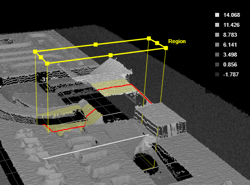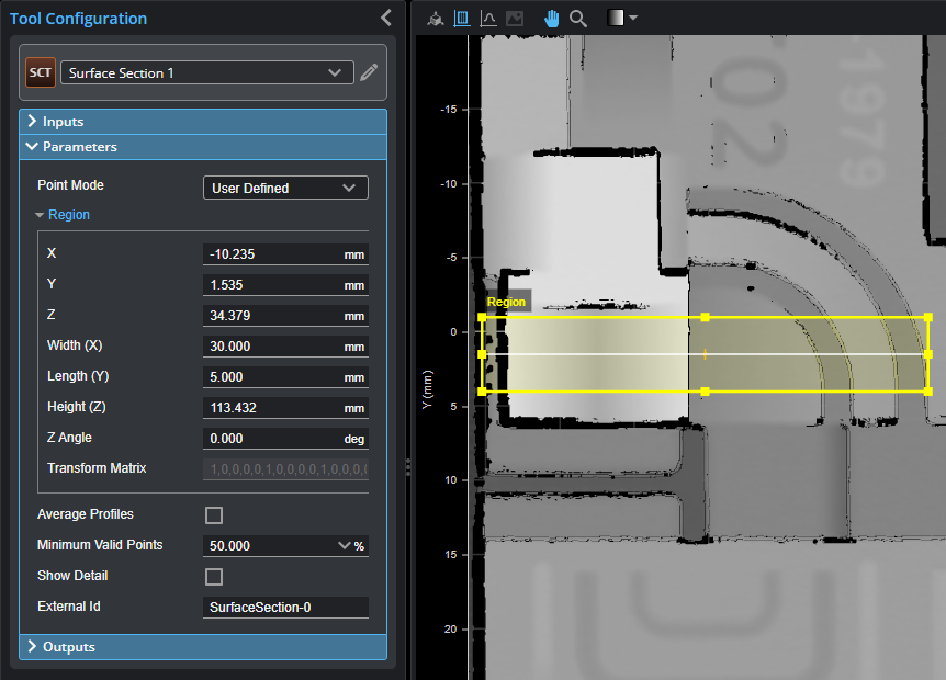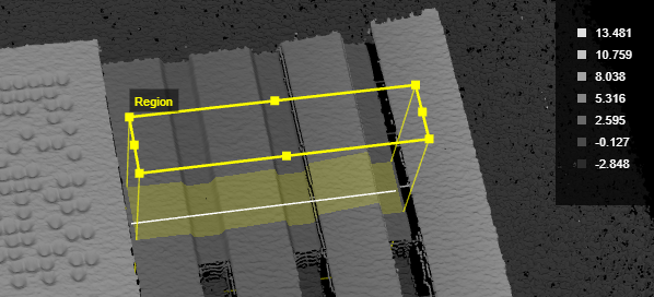 A rectangular region to define the section to extract. By default, the section is taken along the X axis of the region. The length of the region (along the Y axis) is the averaging width for the section. In the following, the region is set to a length of 5 mm and a width of 30 mm. The tool will therefore use a 5 mm averaging window, perpendicular to the X axis (width) of the region, to calculate the data point using its neighbor. If Average Profiles is enabled, the tool averages the points along the entire length of the region.