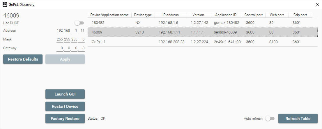 When the GoPxL Discovery tool opens, it lists the sensors running GoPxL and the PC instances of GoPxL that are currently visible on the network. Sensors are identified in the Device/Application Name column by their serial number, and in the Device Type column by their model. If a sensor is running through a PC instance of GoPxL, its status (at the bottom of the tool) is "Device is remotely connected", and you can't perform any operations on it from the tool. Otherwise, the sensor's status is "OK".