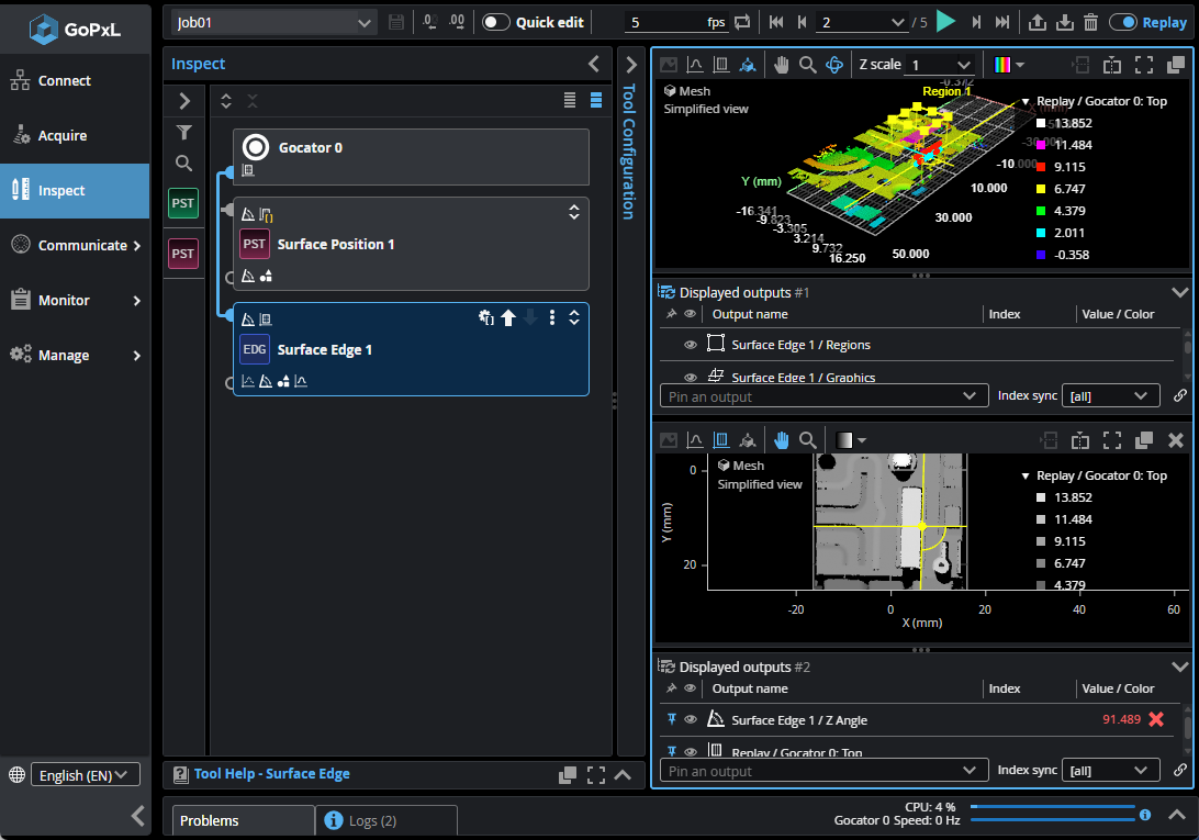 This is the main window in the GoPxL interface that shows scan data. When you configure tools or set the active area, you can graphically configure the regions in the data viewer window. When the view is zoomed out, to reduce processing, the number of data points that are displayed is reduced, as indicated by "simplified view" in the data viewer. When you zoom in enough, the actual data points are all displayed. The legend at the upper right is collapsible.