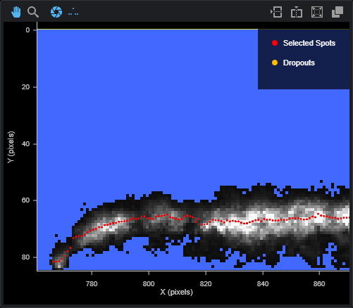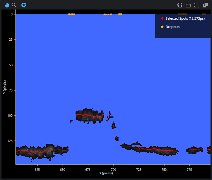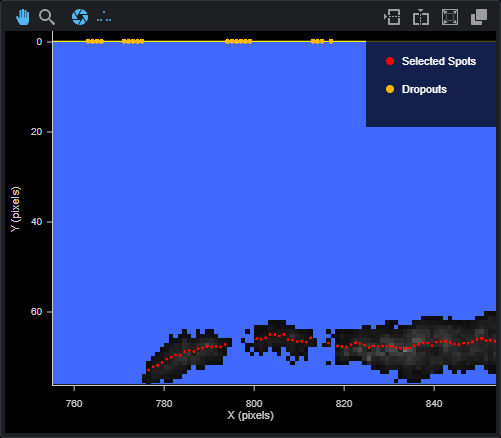 Various settings related to material types (under Scan > Advanced, with Material type set to Custom) and exposure can interact. In Image mode, you can examine how these settings affect. To do this, in Image mode, check the Show Spots option at the top of the data viewer to overlay a representation of the spots in the data viewer.