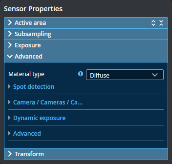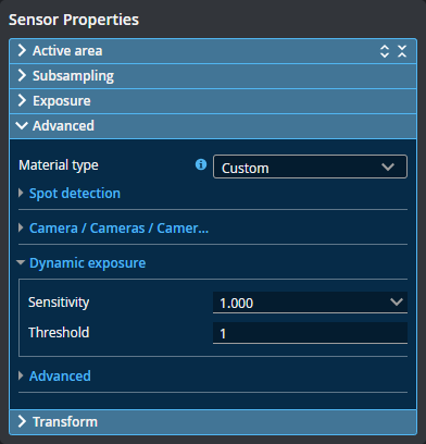 The settings in Acquire page > Sensor Properties > Advanced section let you configure material characteristics, camera gain, and dynamic exposure.