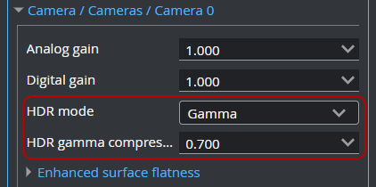 When you enable HDR mode, the sensor applies a gamma curve internally to the video image. High intensity values are compressed to provide better intensity resolution for lower intensity values, which in turn can provide better quality Profile or Surface scan data.