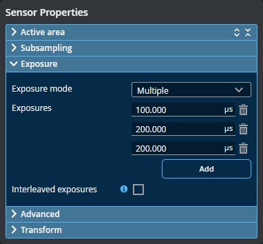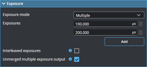 | Interleaved exposures | Outputs the exposures in an interleaved sequence to optimize maximum frame rate. |