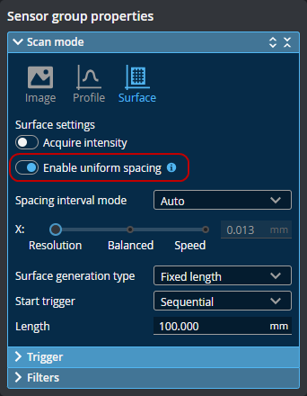 Balanced: Uses the X resolution at the middle of the active area as the spacing interval. This setting balances CPU load, data output rate, and X resolution.