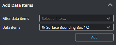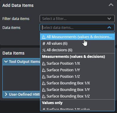 Lets you add sources (such as stamps or measurements) that GoPxL will send to the running HMI. Added connections appear in the Data Items section at the bottom of the panel. If you have many measurements, you can filter them by type to make it easier to find the item you want in the Data Item drop-down. You can enable more than one filter.