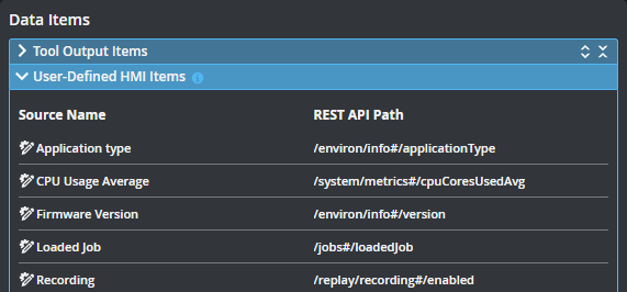 The data listed here will be sent to the running HMI app. For more information, see Data Items. |