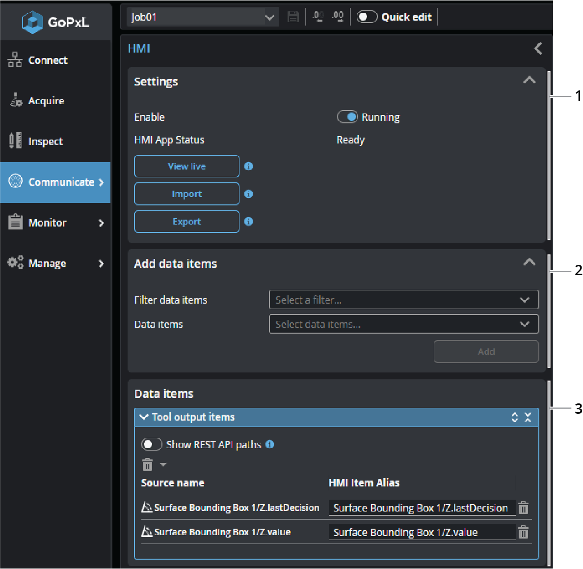 You configure the HMI on the Communicate > HMI page. For information on how to design an HMI app, see GoHMI and GoHMI Designer.